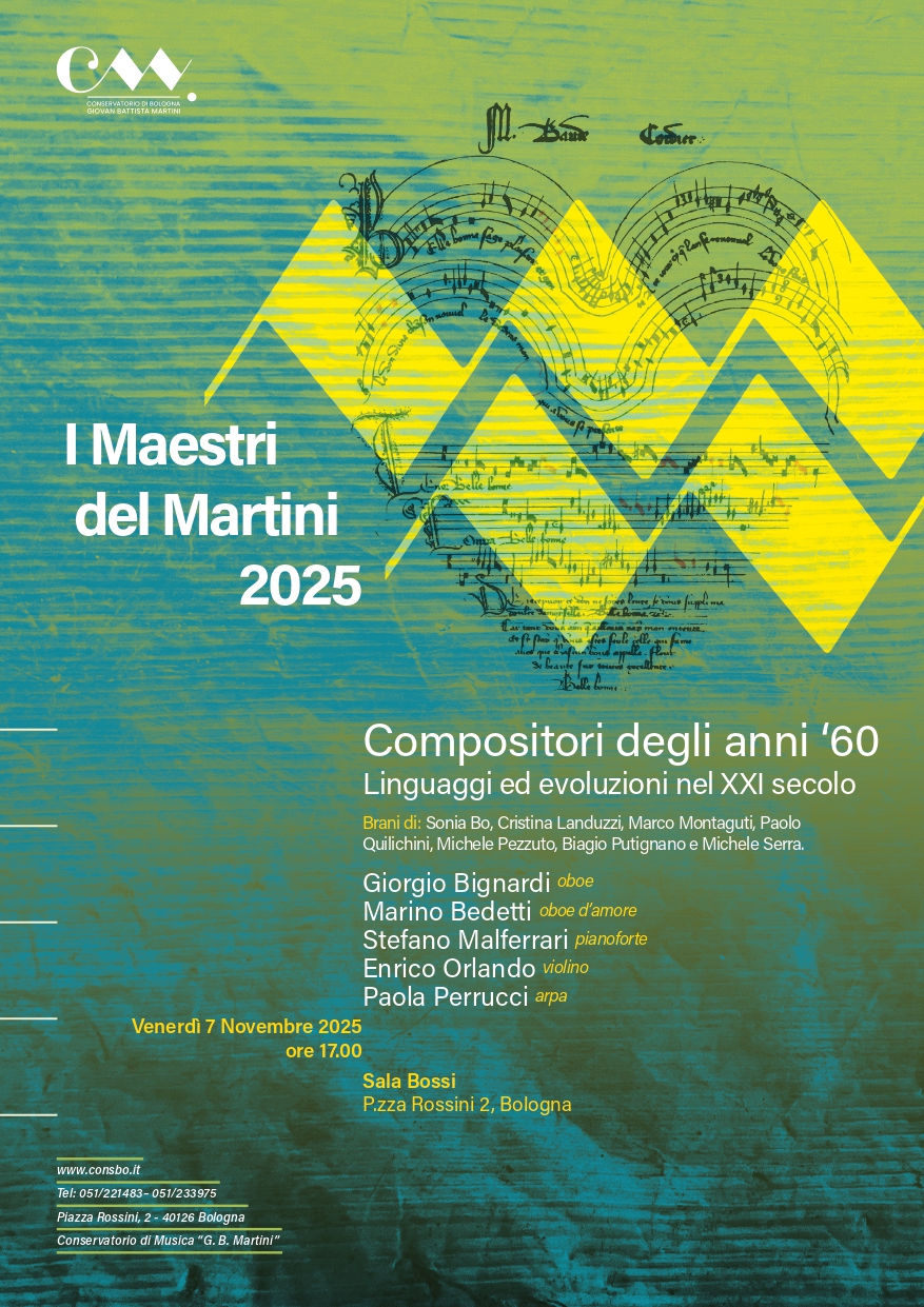 Il Conservatorio di Bologna Giovan Battista Martini, centro vibrante di produzione artistica e ricerca musicale, ogni mese è teatro di una ricca varietà di eventi culturali, tra cui concerti, masterclass e seminari, organizzati per arricchire l’esperienza formativa dei nostri studenti e offrire al pubblico occasioni uniche di apprezzamento musicale. Siamo fieri di ospitare diverse orchestre e band, rappresentative della vivacità e del talento che animano la nostra comunità accademica.
